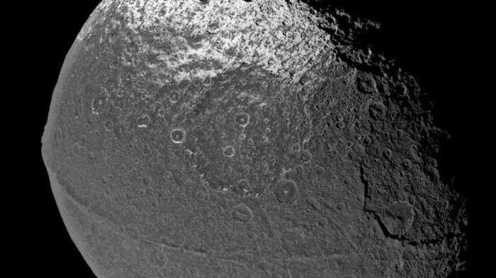 Další velmi zajímavý satelit Saturnu se nazývá Iapetus. Jeho zvláštností je, že jedna z jeho polokoulí je černá jako saze a druhá je bílá jako sníh!