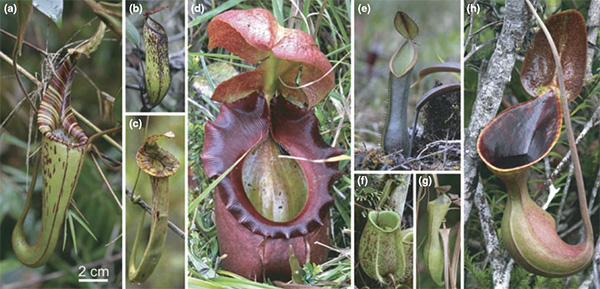 Obr. 1. Rozmanitost tvarů, barev a velikostí džbánů v rod Nepenthes, (a) N. hurreliana, (b) N. muluensis, (c) N. mirabilis var. echinostoma, (d) n.rajah, (e) N. tentaculata, (f) N. ampullaria, (g) N. gracilis, (h) N. lowii. Čerpání z diskutovaného článku v Journal of Evolutionary Biology