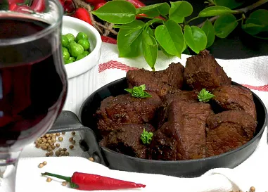 Dušené maso “Aphelia”. Marinované v červeném víně s koriandrem.