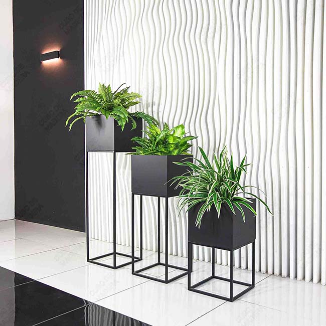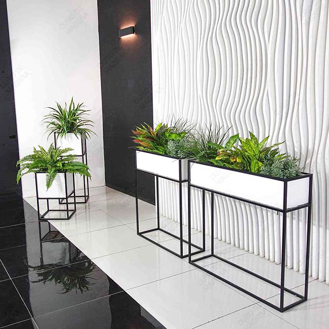 - Podlahové – obvykle umístěné na podlaze, schodech, asfaltu, pokud mluvíme o pouličních modelech. Obvykle poměrně velké, protože se používají pro velké rostliny.