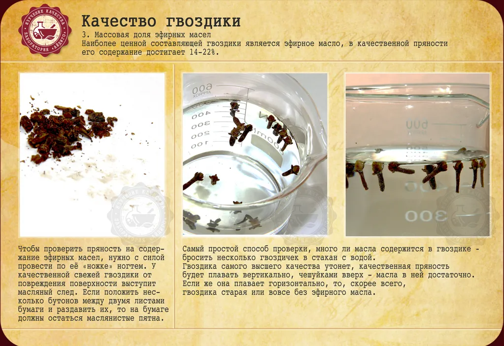Mezi fyzikálně-chemické ukazatele charakterizující koření patří hmotnostní podíl nečistot, drcených zrn a obsah silic. Podle GOST 29047-91 by hmotnostní podíl nečistot rostlinného původu ve vysoce kvalitních vybraných karafiátech neměl překročit 1,5%; je povolen určitý počet malých pupenů, stopek, fragmentů květin, větviček, ale nejsou povoleny cizí inkluze . Mezi nečistoty patří nekvalitní pupeny, větvičky a palice – květní stonky, poletující kolem okvětních lístků poupat. Množství nečistot přesahující normu svědčí o nízké kvalitě koření. Nejcennější složkou hřebíčku je silice, v kvalitním koření její obsah dosahuje 14-22%. Olej obsahuje převážně eugenol (až 85 %), dále glykosidy, karifylén, kyselinu oleanolovou, sliz, humulen, tukové a tříslovinové látky, vitamíny A, B1, B2, PP, minerální látky hořčík, vápník, sodík, fosfor, železo . Vysoká kvalita karafiát by neměly být suché a mastné na dotek. Chcete-li zkontrolovat koření na obsah esenciálních olejů, musíte silou přejíždět nehtem podél jeho „nohy“. Vysoce kvalitní čerstvý hřebíček bude vykazovat olejovou stopu z poškození povrchu. U přesušených a starých se nic takového nepozoruje. Můžete také dát několik karafiáty mezi dva listy papíru a rozdrtit. Pokud při rozdrcení pupenu zůstanou na papíře mastné skvrny, pak je hřebíček vysoce kvalitní.
