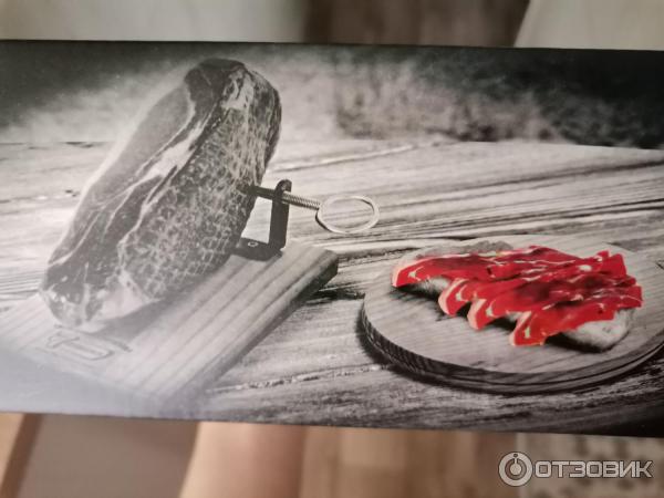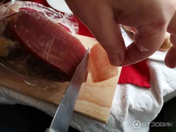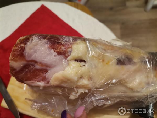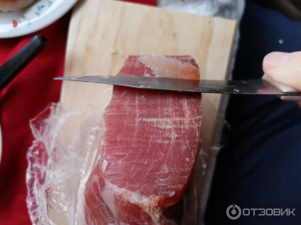 Toto jsou tenké průsvitné kousky, které jsme dostali. Samozřejmě, že jamon by měl řezat profesionál, ale takhle by to mohli udělat. Pokud ignorujete vůni, pak je chuť zcela normální. I když všude na internetu říkají, že je to divoce zdravé, pořád nevěřím, že se bez toho nedá žít, navíc jíst vepřové je vždycky nebezpečné kvůli parazitům. To je v podstatě shnilé syrové maso, dobře, sušené. Je dobře, že je hodně slaný.